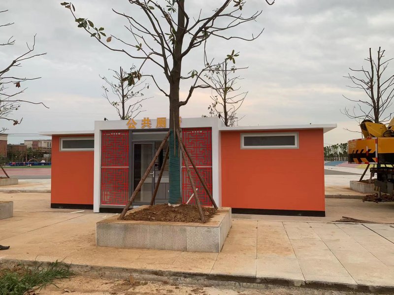 拼裝廁所;在廠里做好各個廁所部件,再到現場組裝在一齊,適合不易運輸的大型廁所。這座箱式廁所,女廁5個蹲位內配工具間,男廁2個蹲位+2小便斗,第三衛生間由殘疾馬桶、助力洗手盆和兒童馬桶、兒童洗手盆外加嬰兒臺等設施。廁所前后有窗,通風采光,前部走廊裝有屋檐,防雨防曬。此廁所位于公路綠道邊,整體大氣,功能齊全,造型美觀,是一道難得的靚麗景觀!